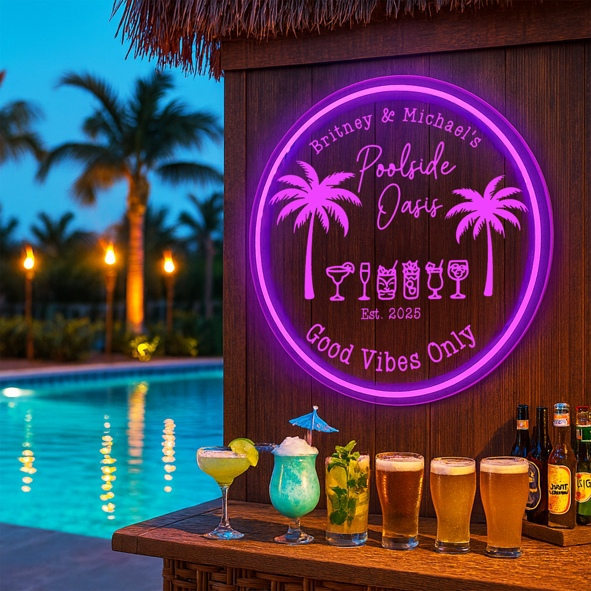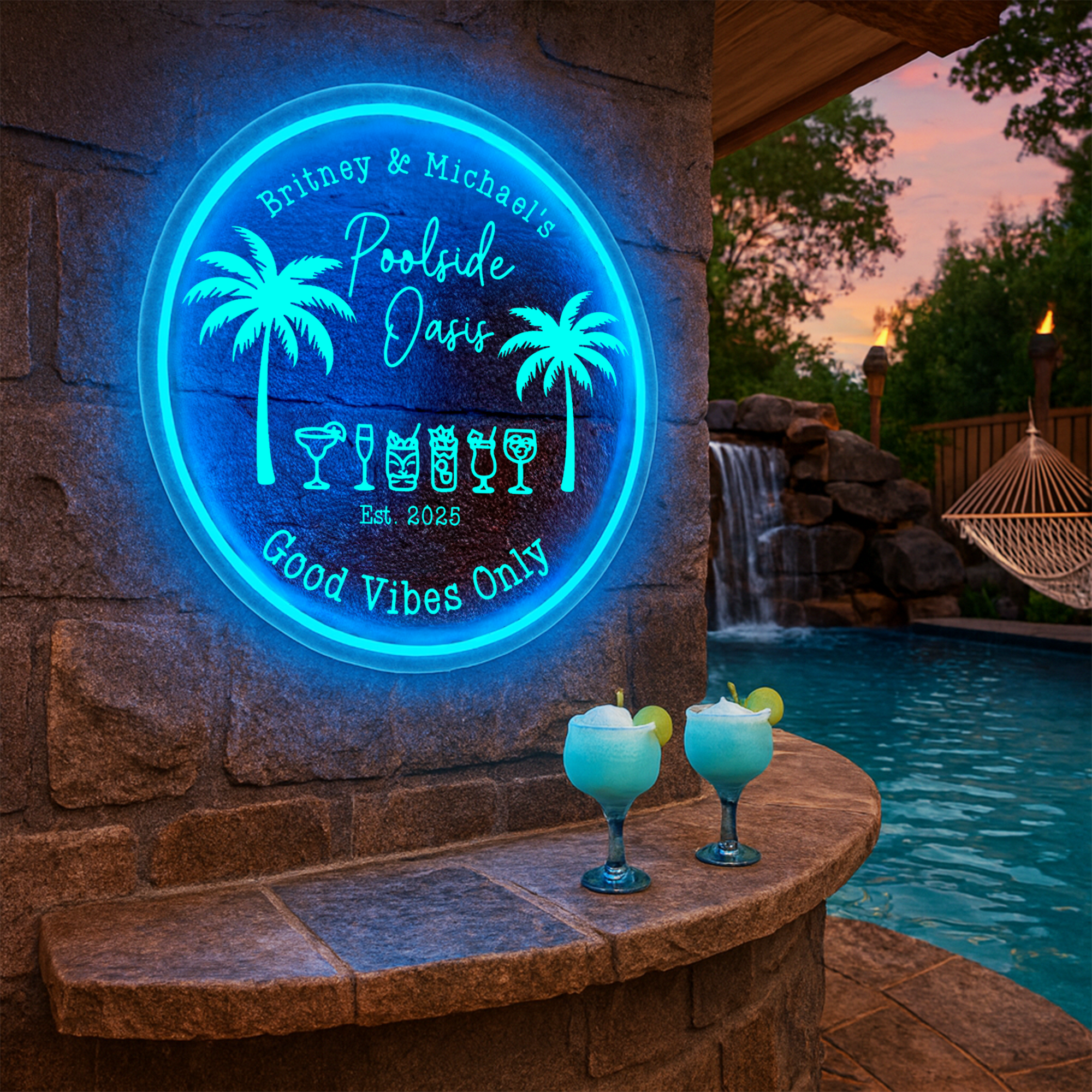 Make a splash in style with the Personalized LED Color Changing Acrylic Poolside Oasis Sign. Featuring vibrant graphics and your custom text, this eye-catching sign brings a refreshing, resort-style vibe to any pool area, patio, or backyard lounge. The smooth, color-changing LEDs cast a cool, ambient glow—perfect for pool parties, sun-soaked afternoons, or unwinding by the water with a drink in hand. Crafted from durable acrylic and built to impress, this personalized sign is the perfect way to turn your outdoor space into a true poolside paradise.